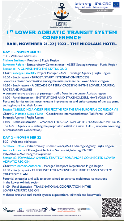 La giornata del 22 novembre (9:30 -13), inizia con i saluti di Salvatore Refolo, Commissario Straordinario di Asset Puglia, e Aurora Losacco Project Officer del Segretariato Congiunto del Programma Interreg IPA CBC Italia-Albania-Montenegro. La terza sessione, presieduta da Vito Antonio Antonacci, Dirigente del Dipartimento Trasporti della Regione Puglia, proporrà le linee guida sviluppate dal Progetto Lasting per uno sviluppo congiunto ed armonico del sistema di trasporto passeggeri nel Basso Adriatico.