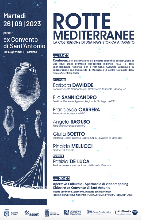 "Rotte mediterranee: la costruzione di una nave storica a Taranto" è il tema del convegno in programma martedì 26 settembre a Taranto - ore 18 nell'ex Convento di Sant'Antonio, in via Luigi Viola 5 - organizzato dall'Agenzia regionale Asset con la Soprintendenza nazionale per il Patrimonio Culturale Subacqueo.