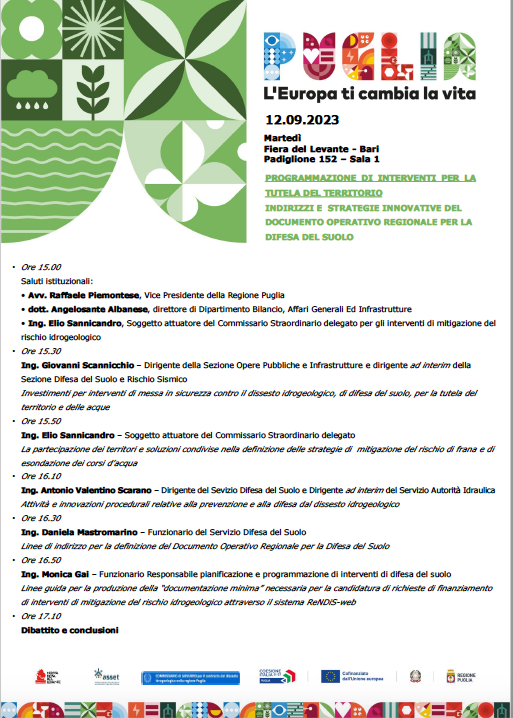 Difesa del territorio e del suolo protagonisti in Fiera del Levante di Bari, grazie al convegno “Programmazione di interventi per la tutela del territorio. Indirizzi e strategie innovative del documento operativo regionale per la difesa del suolo” in programma il 12 settembre, alle ore 15 nella sala 1 del Padiglione 152 della Regione Puglia.