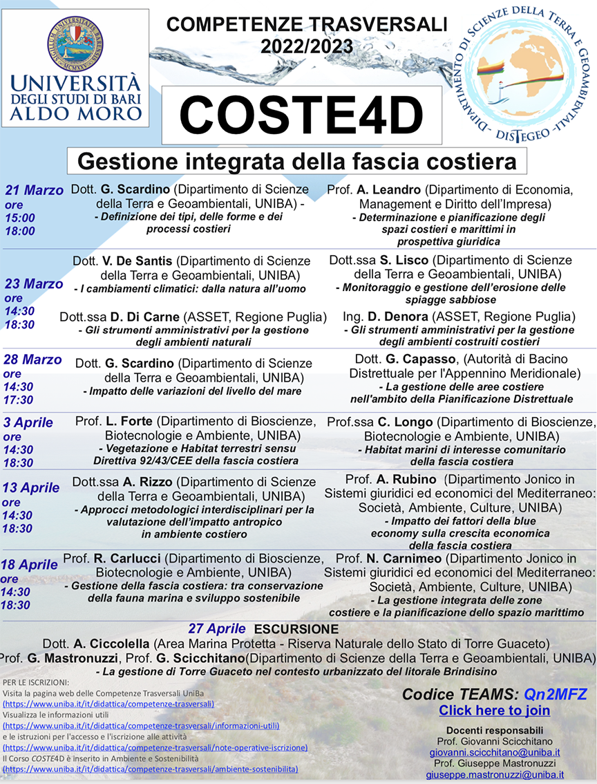 Parte il 21 marzo il corso per competenze trasversali “Coste4D”, sulla gestione integrata della fascia costiera, organizzato da Uniba - Dipartimento di Scienze della Terra e Geoambientali. Gli incontri approfondiranno le metodologie per la definizione morfodinamica, ecologica e amministrativa della fascia costiera, dell’importanza della sua definizione giuridica condivisa, della sua resilienza all’azione antropica e ai processi naturali, del ruolo socio-economico delle attività che vi si concentrano.