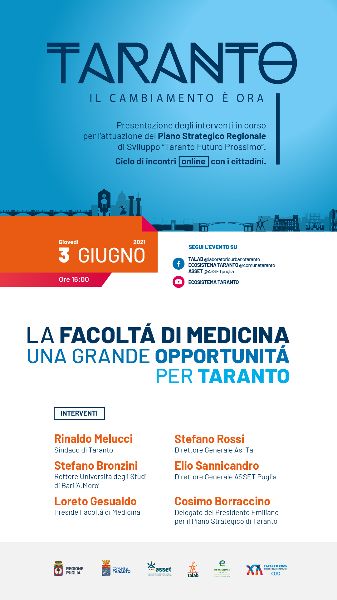 Giovedì 3 giugno, alle ore 16.00, in diretta sulla pagina Facebook e canale Youtube di Ecosistema Taranto (è possibile seguire l'incontro anche sulla pagine Facebook di Asset e Talab), si parlerà de ‘ La Facoltà di Medicina, una grande opportunità per Taranto’. 60 minuti per parlare non solo della realizzazione della sede universitaria tarantina nello storico palazzo dell’ex Banca d’Italia, ma anche per presentare i nuovi lavori di ampliamento.
