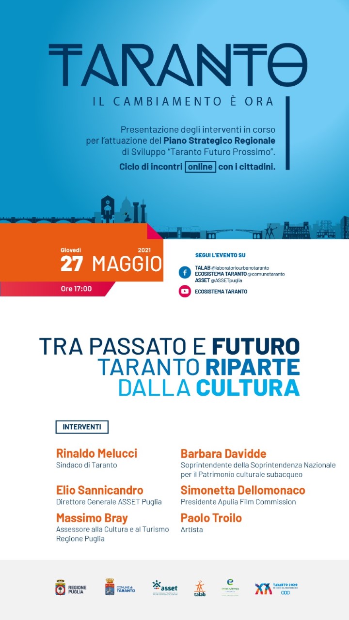 Si intitola infatti ‘Tra passato e futuro, Taranto riparte dalla cultura’, il webinar in diretta giovedì 27 maggio , alle ore 17.00, sulla pagina Facebook e canale Youtube di Ecosistema Taranto (è possibile seguirli anche sulla pagine Facebook di Asset e Talab).