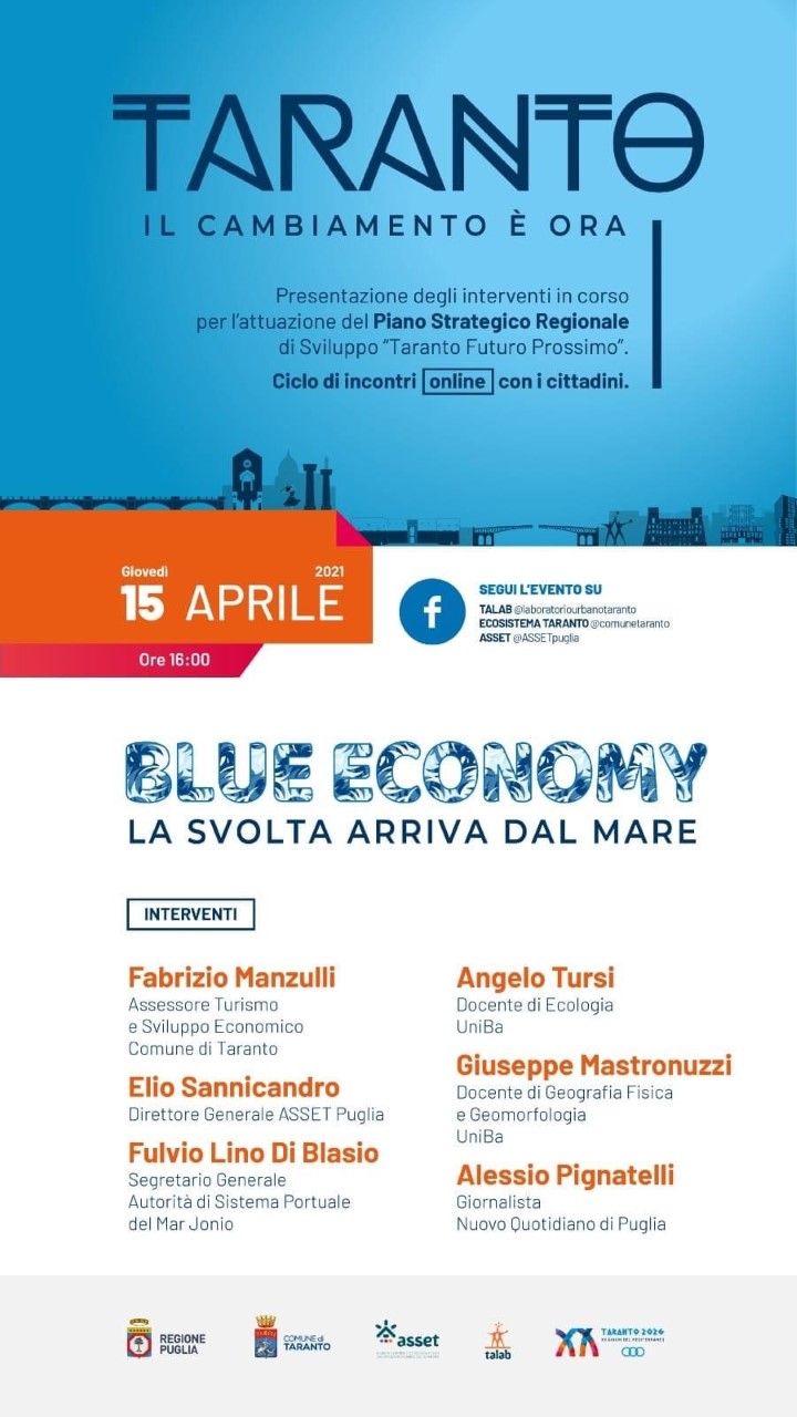 Giovedì 15 aprile, dalle ore 16.00 alle 17.00, si parlerà di “ Blue Economy, la svolta arriva dal mare”. Intervengono l’assessore al Turismo e allo Sviluppo Economico del Comune di Taranto, Fabrizio Manzulli, il Direttore Generale di Asset Puglia, Elio Sannicandro, il Segretario Generale dell’Autorità di Sistema Portuale del Mar Jonio, Fulvio Lino Di Blasio, il prof. Angelo Tursi, docente di Ecologia UniBa, il prof. Giuseppe Mastronuzzi, docente di Geografia Fisica e Geomorfologia UniBa, e Alessio Pignatelli, giornalista del Nuovo Quotidiano di Puglia ( in allegato locandina dell'evento).